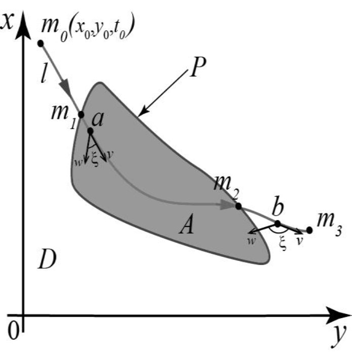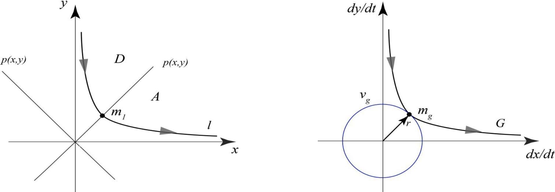 Годограф фазовой скорости G получается путем непрерывного отображения l на плоскость . Также верно, что существует непрерывное отображение для множества на плоскость xOy. Таким образом, если на G найдутся точки условного экстремума (общие для G и V), то эти точки будут отражены на l, т.е. существует непрерывное отображение . Пары , которые содержат координаты mi и ее скорости , могут быть использованы для описания изменения состояния динамической системы. Достаточность такого описания определяется тем, что пары на фазовой траектории образуют геометрическое место точек, фазовая скорость которых принимает экстремальные значения. Множество, сформированное парами , задает закон изменения состояний вдоль траектории.