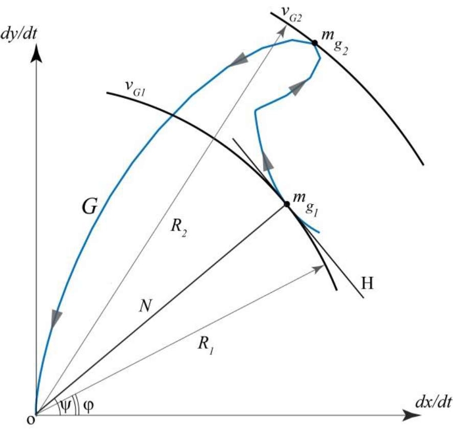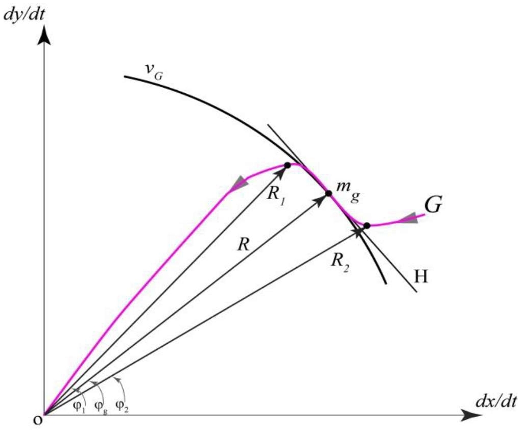Интуитивно понятно, что граница между ускоренным и замедленным движением (P на рис. 1) соответствует равномерному движению, т.е., если , то (рис. 2с). Фактически граница P или условие определяет на фазовой плоскости геометрическое место критических точек, в которых и, одновременно, . Если при каких-либо начальных условиях , то найдутся точки ( m1 и m2, рис. 1), которые могут являться экстремумом фазовой скорости на (такой экстремум в математическом анализе называется условным или относительным [4]), т.е. сформируется множество . Рассмотрим выполнение необходимых и достаточных условий существования условного экстремума в точках m1 и m2 (рис. 1). Для этого будем использовать усовершенствованный метод фазовой плоскости [5], суть которого заключается в построении годографа фазовой скорости в декартовой системе координат (рис. 3) и поиска точек касания изолиний фазовой скорости и G. Годограф фазовой скорости ‒ кривая G, вычерченная концом радиус-вектора R: