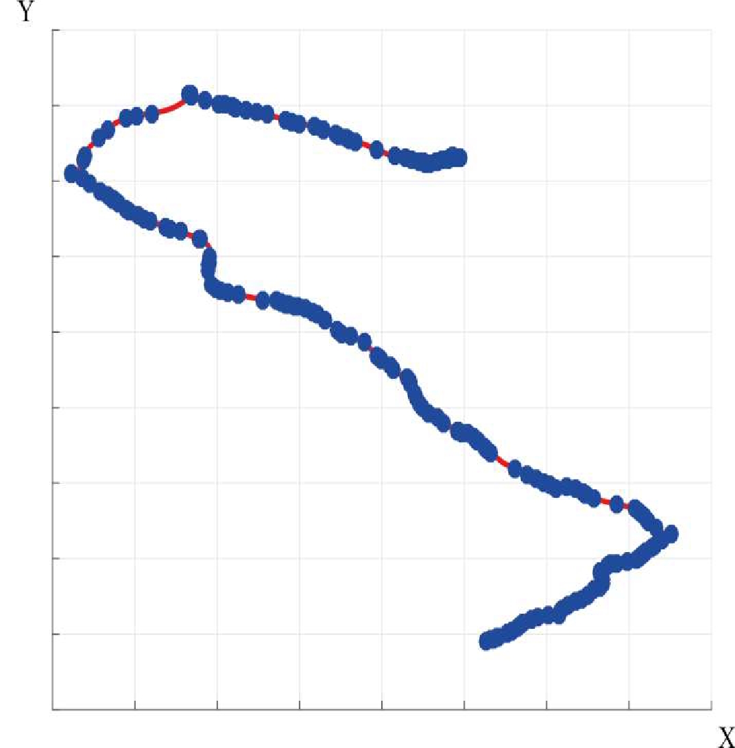 В данной работе мы подробно остановимся на решении первой задачи. Ранее было предложено описывать состояние динамической системы парой или . Рассмотрим движение в транспортном потоке (подобные задачи рассматриваются в теории массового обслуживания, теории игр и др. [9, 10]). Траектория движения – кривая на плоскости географических координат X-Y. Кривая строится по точкам, которые могут быть получены, например, по данным GPS-приемника. Для этого в процессе эксперимента использовался туристический навигатор GARMIN, который фиксировал путевые точки с постоянным шагом, равным 1 сек. После обработки массив точек был нанесен на плоскость X-Y (рис. 8).