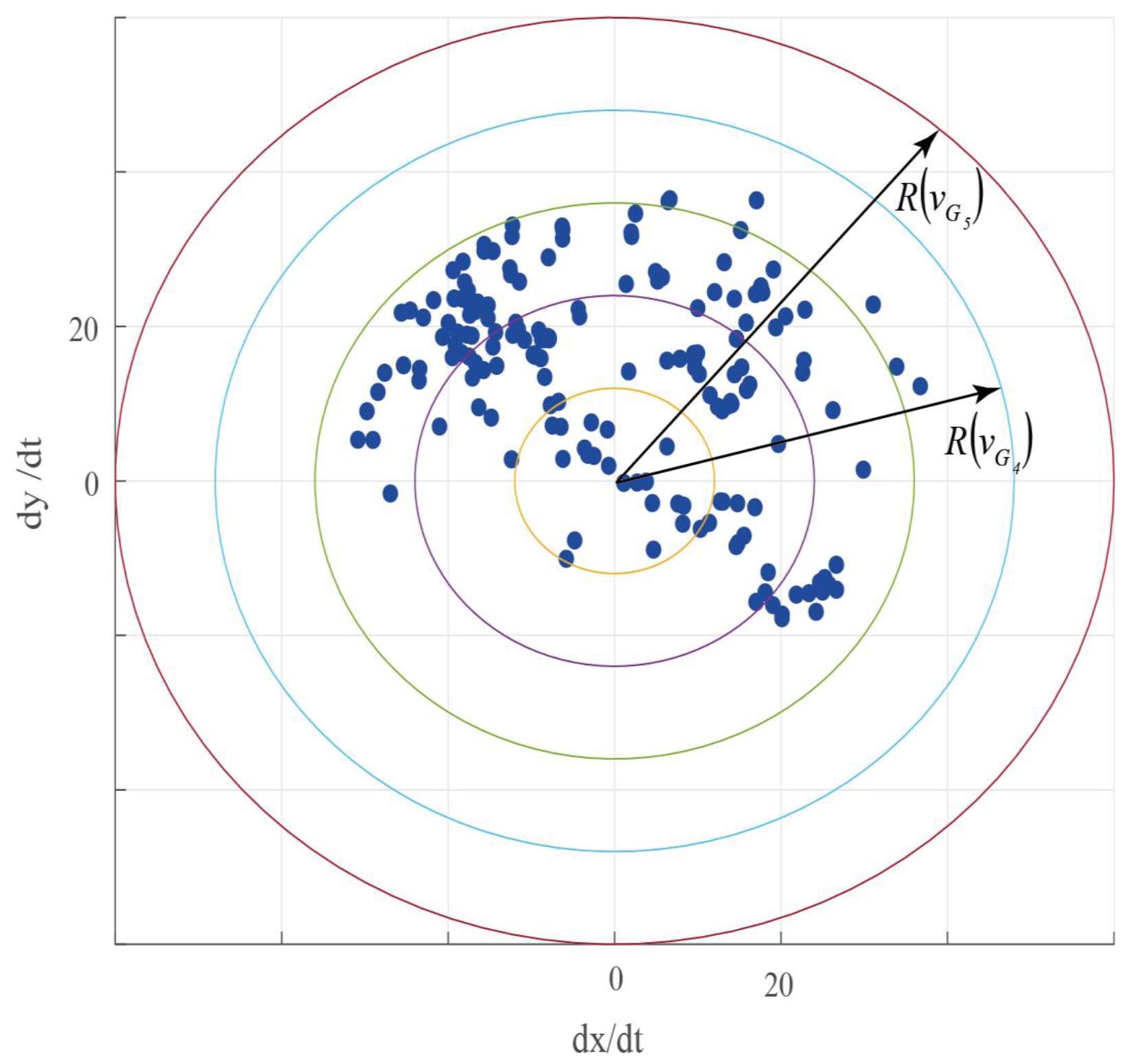 Пары наносятся на траекторию. Однако использование фазовой плоскости в данном случае не наглядно. Удобнее использовать плоскость годографа фазовой скорости , на котором экстремумы фазовой скорости – множество (облако) точек (S). Фазовая скорость (скорость движения ТС вдоль траектории) на плоскости годографа задается окружностями радиуса . Выполним сегментирование плоскости годографа окружностями, выбрав, предварительно, диапазоны фазовых скоростей (рис. 9). После этого, в качестве топологического описания облака S будем рассматривать полигон частот распределения точек в соответствующих кольцах (рис. 10).