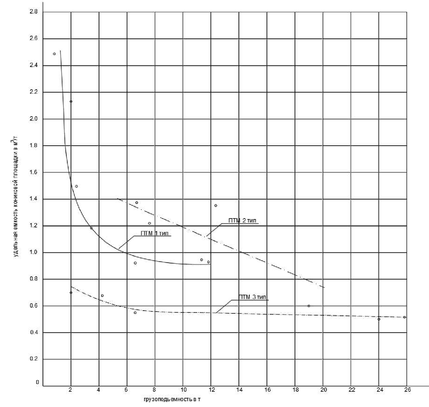 Рис. 3. График зависимости удельной емкости кониковой площадки погрузочно-транспортных машин от их грузоподъемности
