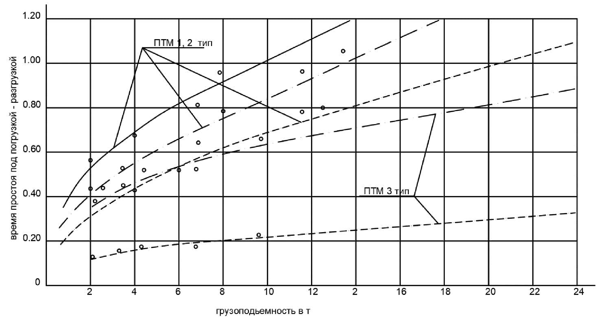 Пользуясь нормативным временем простоя погрузочно-транспортной машины под погрузочно-разгрузочными операциями [1, 2, 5-12], в зависимости от типа и грузоподъемности погрузочно-транспортных машин, а также способа работ, построим график , для наиболее типичных сортиментов (рис. 6).