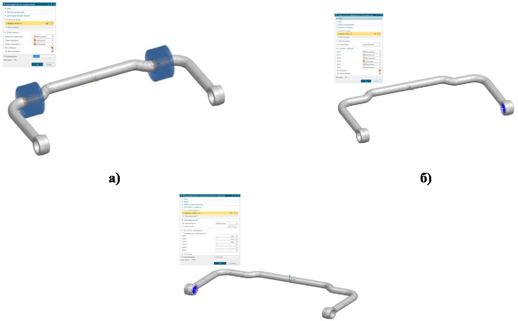Граничные условия для стабилизатора поперечной устойчивости во всех четырех расчетных случаях выбраны в соответствии с закреплениями в конструкции подвески натурного транспортного средства (рис. 3).