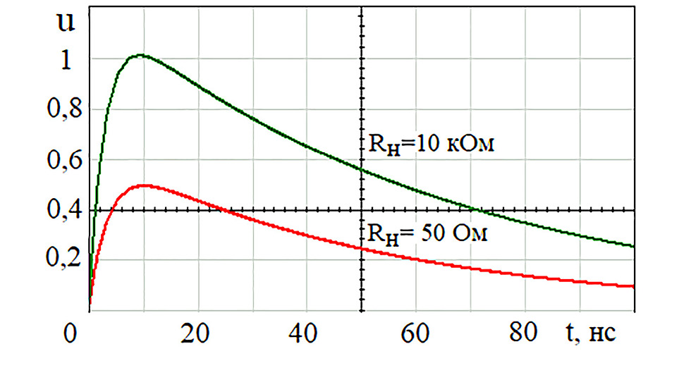 Для получения длительности фронта 5 нс, длительности импульса 50 нс и единичной амплитуды импульса Um = 1 по ГОСТ IEC 61000-4-4-2016 следует положить E = 1,261, τ1 = 3,3 ∙ 10-9 с, τ2 = 56 ∙ 10-9 с.