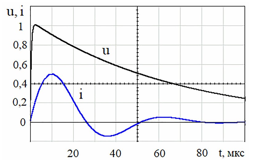 Рис. 6. Изменение напряжения u на выходе модели генератора импульсов 700 мкс по IEC 61000-4-5 на холостом ходу и тока i при коротком замыкании выхода.