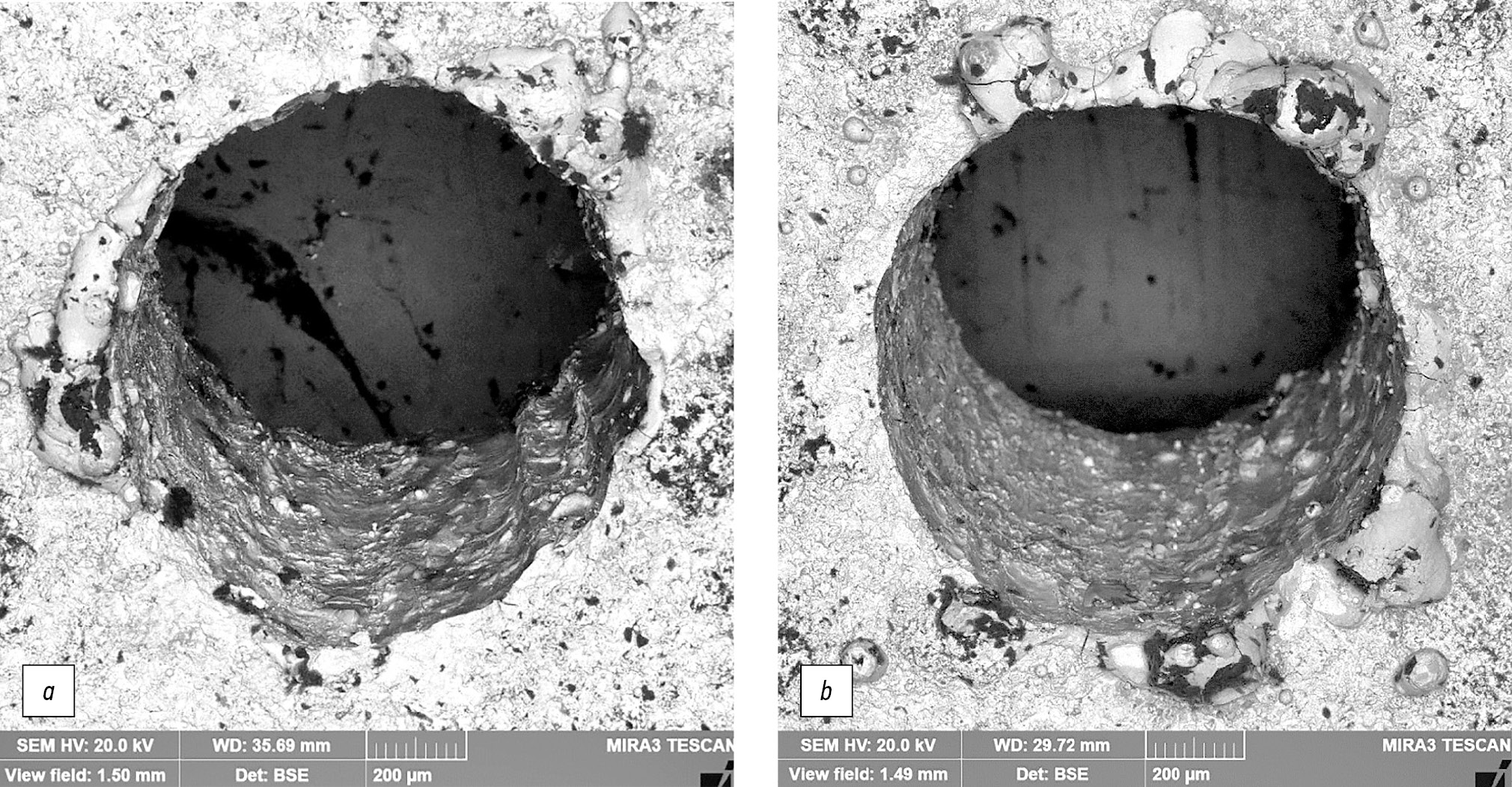 Fig. 8. Qualitative comparison of holes drilled at 40° to the surface. View from the laser output side: а, sample covered with paste; b, sample without paste.