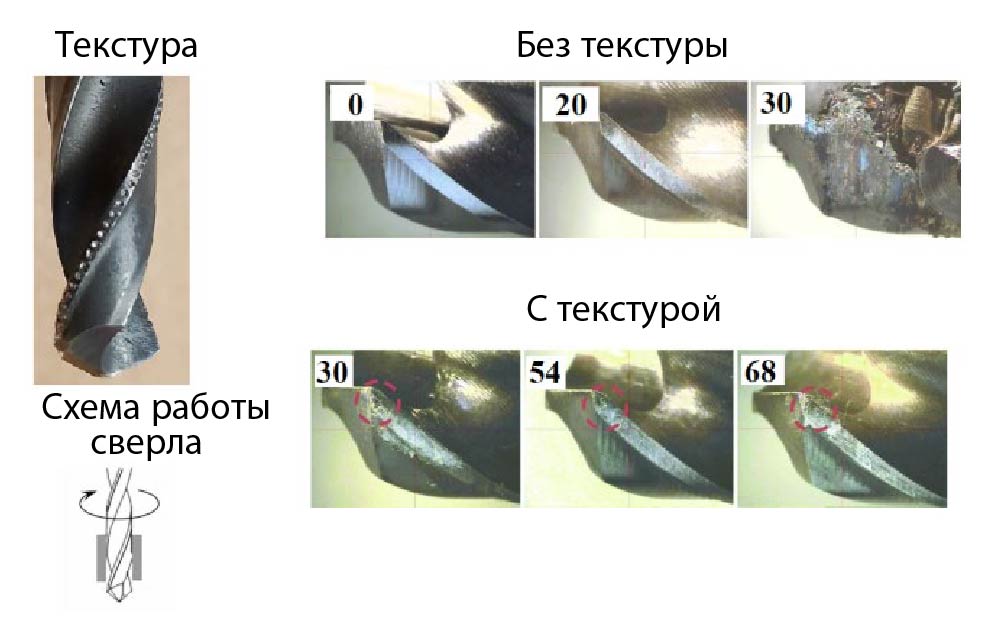 Установлено, что сверла без текстуры вышли из строя при 20–30 отверстиях в зависимости от условий испытаний. Сверла с 10 % текстурированной кромкой показали лучшие результаты: первое сверло вышло из строя при 45 отверстиях, а оставшиеся два сверла — при 70 и 78 отверстиях. Сверла с 20 % текстурированной кромкой вышли из строя при обработке 72, 30 и 71 отверстий.