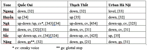 Table 1. Phonemic-phonetic Features of Quốc Oai tones, Thạch Thất tones4 and the urban Hà Nội tones5