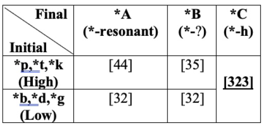 - The process of shedding some syllabic elements at the end of syllables such as /*-?, *-h / is compensated by 3-tone opposition, occurring about before the 10th century.