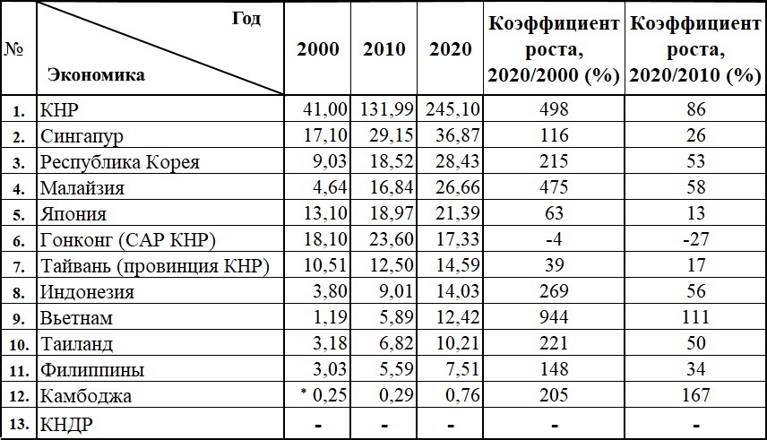 Прирост доли Азиатского региона в общем объёме мировой торговли обеспечен главным образом Китаем. Исследование динамики пропускной способности портов стран Восточноазиатской портовой системы (ВАПС) за 2000–2021 гг. (табл.1) показывает, что в пятерку региональных лидеров, кроме КНР, входят, согласно рейтингу, Сингапур (2-е место), Южная Корея (3-е), Малайзия (4-е) и Япония (5-е).