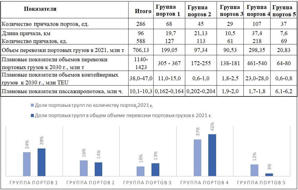 Особенностью портовой структуры СРВ является очевидная неравномерность распределения и по количеству портов, и по объёмам перевозки портовых грузов. Лидирующие позиции занимает Группа портов 4 со 107 причалами и грузооборотом 298,35 млн т (2021), что составляет 44 % от общего грузооборота в 706, 13 млн т всей портовой системы Вьетнама (табл. 2). Наименее продуктивной с точки зрения грузооборота является Группа портов 5 (20,83 млн т в 2021 г.)
