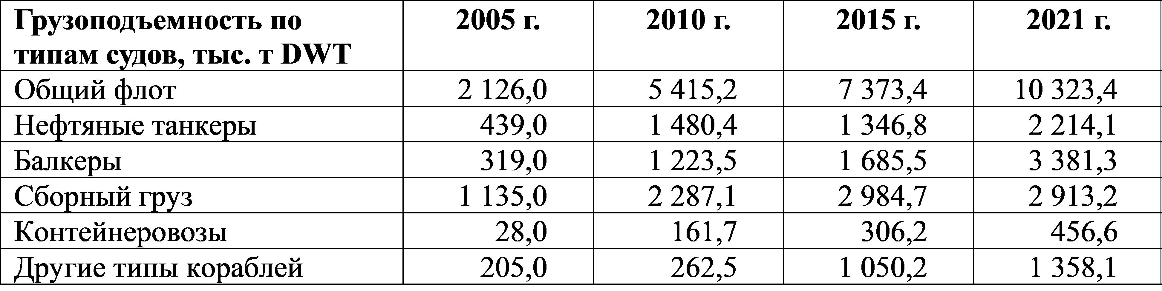 Таблица 3. Грузоподъемность национального флота Вьетнама в 2005–2021 гг., в т. ч. по типам судов (тыс. т DWT)