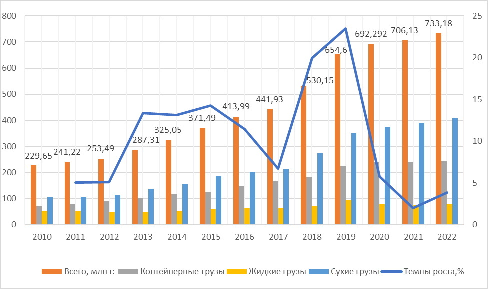 Грузооборот вьетнамских портов в 2022 г. оценивается в 733,18 млн т (рис. 3), что на 4 % больше, чем в 2021 г. Среди них экспортные товары достигли 179 млн т (-3 % к 2021 г.), импортные – 209,2 млн т (-2 % к 2021 г.). Причина спада связана с политикой Zero COVID Китая и многих ключевых стран-экспортеров, которые охвачены как инфляцией, так и рецессией. При этом грузооборот отечественных товаров достиг почти 343 млн т (+12% к 2021 г.). По предварительным оценкам в 2022 г. грузооборот в контейнерах составил 25,09 млн TEU, что на 5 % больше, чем в 2021 г. [2022 Yunnan Gan Hou…: 30.12.2022].