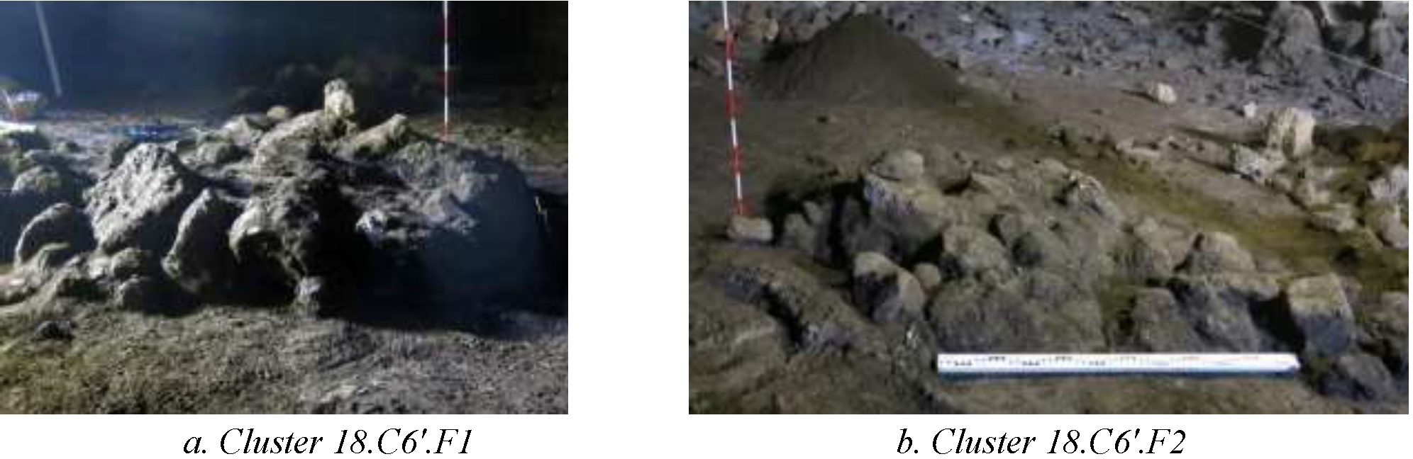 The two excavation pits share the same stratigraphy from top to bottom, including the top layer – a basalt layer with rocks over 20 cm in diameter. The second layer is a dark brown soil layer containing fragments of animal bones. One layer below is a dark brown soil layer of pebbles less than 5 cm in diameter. Surrounding each cluster are stones of basalt arranged in an arc. The excavation pit dates to 4,160±20 BP, with an adjusted value of 4,707 BP, similar to the age of the latest layer in Cave C6.1. The excavators believe that the stone clusters are hearths made by hunters in which the teeth and bones of wild animals were discarded.