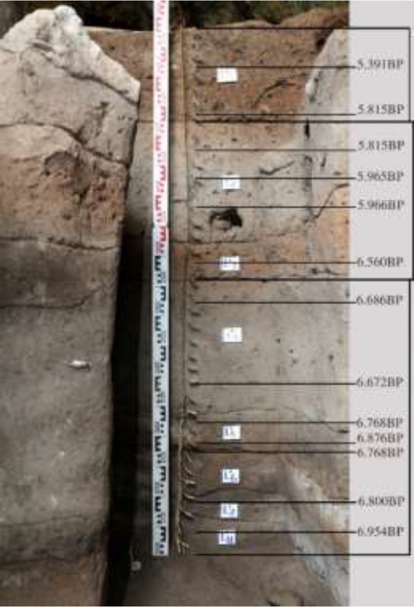 The stratigraphy of Cave C6.1 shows that humans had a continuous residence for nearly 3,000 years, from 7,000 to 4,500 BP. The first residence dates to 6,090±25 BP, with an adjusted value of 6,954 BP. The latest age dates to 4,680±20 BP, but it is not the most recent layer of the archeological site. Cave habitation is believed to have ended around 4,000 BP [Nguyen Khac Su et al. 2020] (fig. 3).