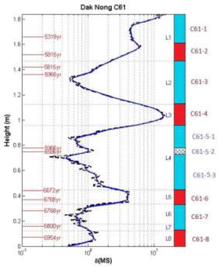 From an analysis of magnetic susceptibility data of 185 ancient samples from the 1.85 m-thick stratigraphy at Cave C6.1, Luu Thi Phuong Lan has divided the stratigraphy into four cold periods (blue): C6.1-1, C6.1-3, C6.1-5, C6.1-7 and four warm periods (red): C6.1-2, C6.1-4, C6.1-6, C6.1-8. The C6.1-5 cold period is classified in more detail: there is a short warmer period (C6.1-5-2) between the two colder periods (C6.1-5-1 and C6.1-5-3). From 6,900 to 5,391 BP, there were two overlapping weather cycles in Cave C6.1: a cycle of 475 years and another of 317 years [Luu Thi Phuong Lan et al. 2021] (Fig. 4).