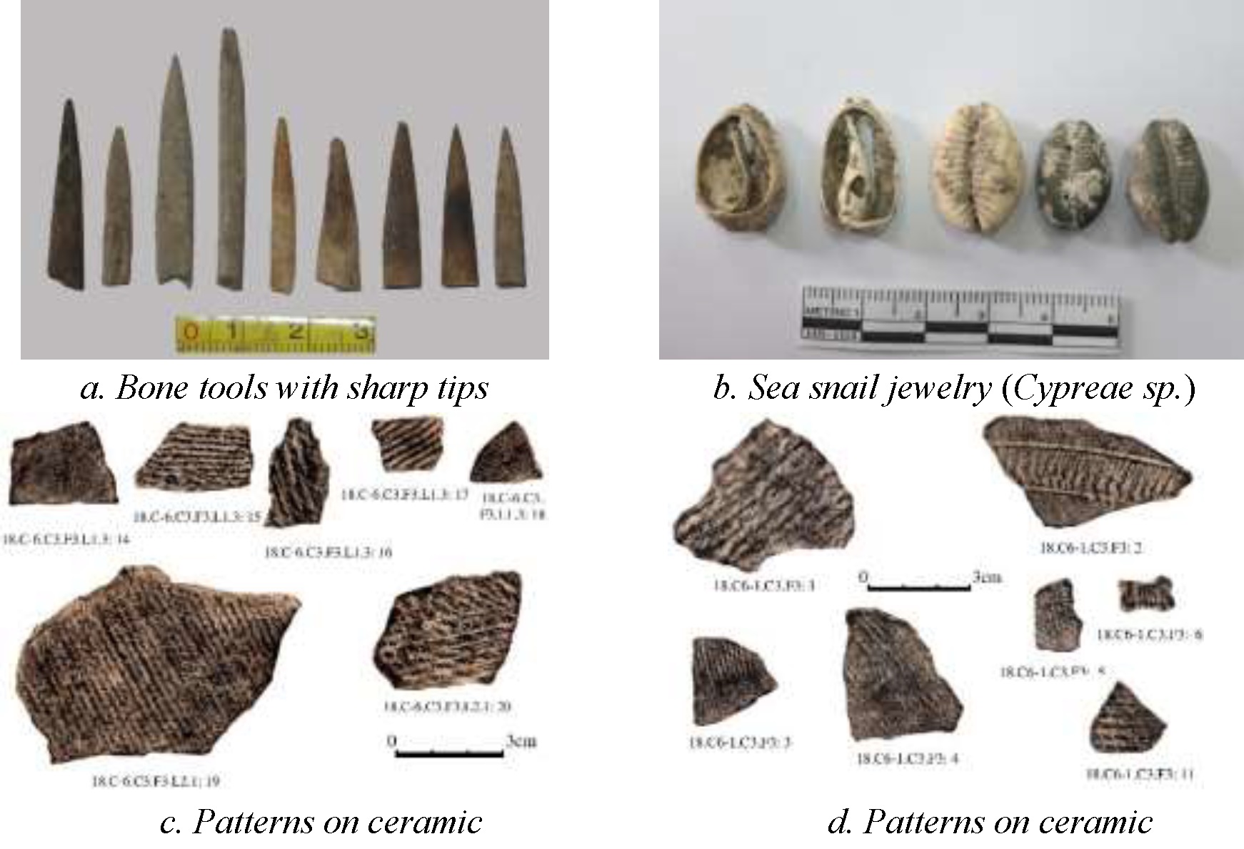 Fig. 6. Bone tools, mollusks, and ceramic patterns from Cave C6.1. Source: [Nguyen Khac Su et al. 2018]
