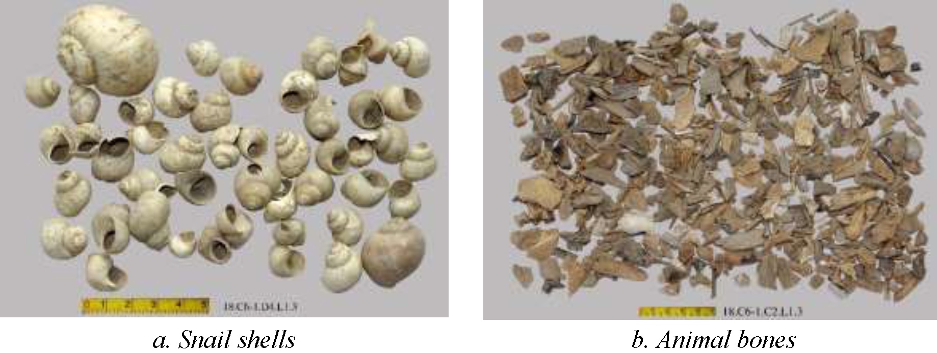 Hunting-gathering was the main activity of the prehistoric inhabitants of Cave C6.1. Among the 76,425 animal bones found, there is no evidence of domesticated animals. Hunting and gathering activities increased from the earliest to the latest stage, as demonstrated by the increase in animal bones and mollusk shells from bottom to top. Fig. 7 shows animal remains collected in Cave C6.1.