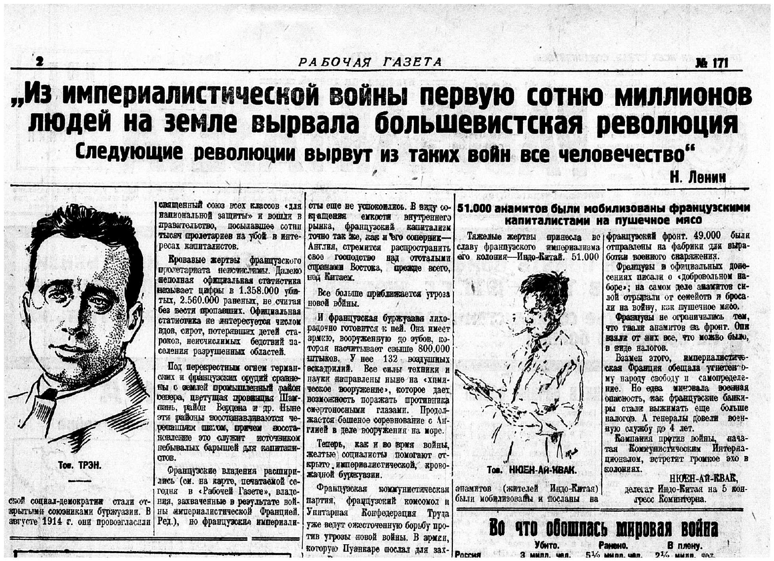 29 июля в московской «Рабочей газете», органе ЦК ВКП(б), была опубликована небольшая заметка Нгуен Ай Куока «51.000 аннамитов были мобилизованы французскими капиталистами». Её сопровождал портрет индокитайского делегата, выполненный неизвестным художником.