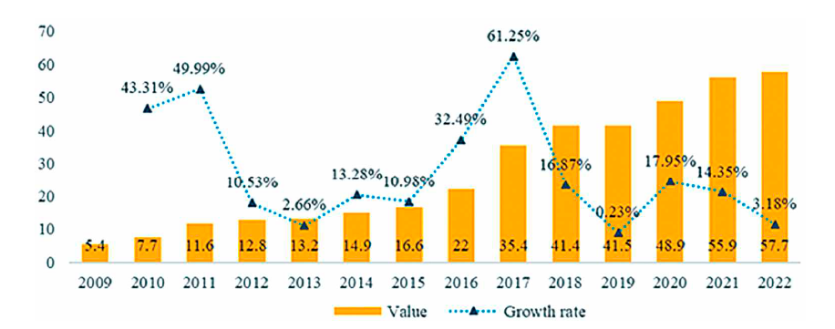 Fig. 4. Value (in billion USD) and growth rate of import from China from 2009 to 2022. Source: General Statistics Office of Vietnam and Vietnam Customs