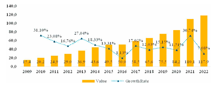 Fig. 2. Value (in billion USD) and growth rate of export to China from 2009 to 2022. Source: General Statistics Office of Vietnam and Vietnam Customs