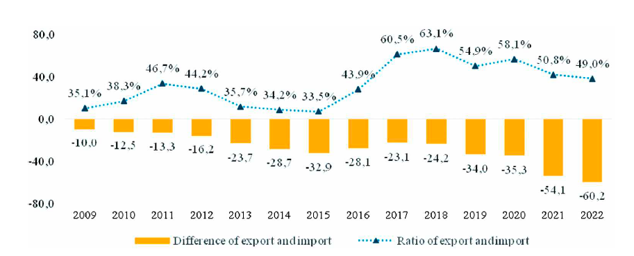 From 2009 to 2022, both export and import between Vietnam and China have increased, but not steadily and at different rates. According to data from GSO and Vietnam Customs, the bilateral trade balance between Vietnam and China has deteriorated from 2009 to 2022. In 2009, the trade deficit between Vietnam and China was only USD -10 billion, with an export-import ratio of 35.1%. However, by 2022, the deficit had increased significantly to -USD60.2 billion, almost six times higher than in 2009, with an export-import ratio of 49% (fig. 5).
