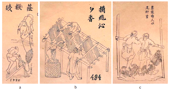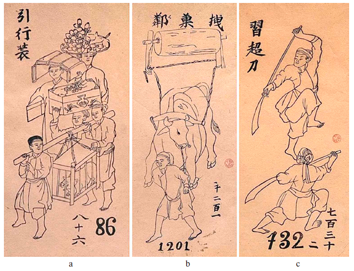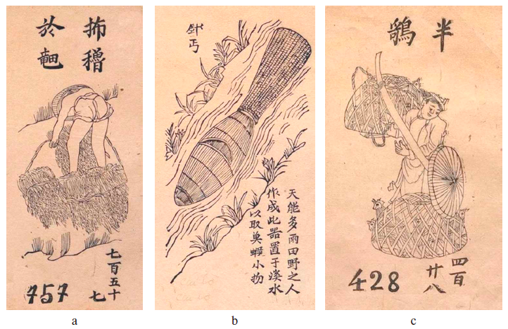 Compared to other traditional folk paintings, the TA can express a variety of materials through the lines. It might depend on the requirements and purposes of Henri Oger's research to focus on the description of materials. Although they did not use colour, the artisans fully exploited the expressive element of line. The various materials of daily life and productive labor are flexibly and delicately expressed by Vietnamese artisans. For example, the painting “Thu hoạch lúa” (The harvest) shows a figure bending over a bundle of rice in a field (Figure 8a). The imagery is imbued with folk style and traditional space. Artisans used simple drawings and engravings to represent various materials such as leather, cloth, palm leaves, bamboo sheaves, and rice bundles. This can also be seen in some other typical paintings such as “Cái đó đơm cá” (Conical fishing basket) and “Bà bán gia cầm” (The poultry seller) (Figures 8b and 8c).