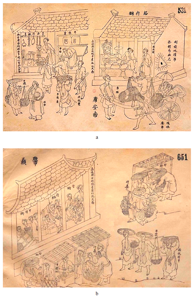 In the 2009 edition of An Nam People's Techniques, engravings such as “Cửa hiệu tạp hóa” (Dry goods store), “Bán gạo” (Rice selling) and “Phố An Nam” (Annam Street) were compiled to express the vivid picture of Vietnamese society in the early twentieth century [Oger 2009]. The engravings are simplified and concise, giving the painting a clear layout. In addition, the characters all interact with each other according to their fields.