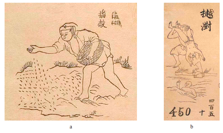The painting “Gieo mạ” (Rice sowing) (Figure 4a) shows the character in a moving position. To represent this activity taking place in the field, the artisans used short curved lines and small dots to depict the promontories and grass bushes at the edge of the field. This is also shown in the painting “Cứu người chết đuối” (Help for the drowning) (Figure 4b) with a few simple lines. The artists used simple visual languages but achieved high visual effects.