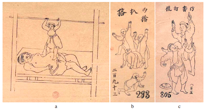 In creating folk paintings or carving communal houses, artisans depict things in space according to their understanding and perception, without visual rules. Therefore, their drawings give the audience a feeling of connection and familiarity. According to the opinion of folk artisans when creating their works, drawings need “to be stylized”, “to catch a moving figure” and it is important to achieve the “spirit” [Trương Minh Hằng 2011:1231]. The same goes for the TA, the visual languages are created from a highly generalized line system, no coloring, no dark or light spots, and the drawings are built from practical activities in daily life. Like the layout elements, the form and shape elements of the TA are very conventional. The body shapes of the characters are not constrained by actual proportions, but focus mainly on describing the characters' activities and expressions. On the other hand, the body shape is also enlarged or reduced according to the content to attract the viewer's attention. For example, in the painting "Bà đỡ xoa bóp cho sản phụ" (Midwife massaging a woman to give birth), the body proportions between the midwife and the pregnant woman showed a major difference (Figure 5a). Perhaps the mother figure is the main focus of the painting, so the craftsman intentionally drew her many times larger than the midwife. This creates an interesting absurdity in the painting. The painting "Trò chơi trẻ con" (Games of young children) shows four characters with similar proportions and clothes (Figure 5b). It is a drawing of four children playing together a traditional folk game of Making Tiger and Catching Pigs. Although a closed system of strokes has been simplified in this picture, the picture is not monotonous because of the posture and movements of the characters participating in the game.