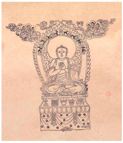 In addition to describing different materials through lines, artisans also demonstrate the ability to carefully and meticulously describe objects, especially in Buddhist topics. Floral and animal motifs with many winding lines are meticulously and delicately depicted by artisans. The skilful combination of lines has created attractive paintings. The painting “Phật” (The Buddha) shows the Buddha sitting on a lotus, surrounded by elaborate and delicate decorations (Figure 9). In addition, several paintings on this topic are skillfully expressed through lines, an effective visual language.