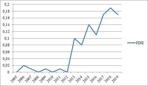 Fig. 2. FDI Equity inflows from Vietnam to India (2005 to 2019), USD billions. Source: Department of Promotion of Industry and Internal Trade (India)