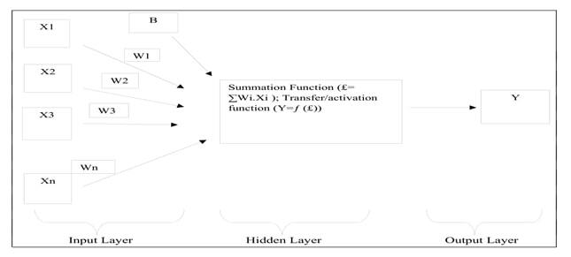 Artificial neural network is a machine learning method, which has evolved and developed from the scheme of imitating the human brain (Fig. 3). Artificial neural network technique can help in building the relationship, handling parallel data processing, nonlinear mapping of odd data and learn or adapt from environment [Khan, Ahmed and Prasad 2015; Paswan et al. 2018]. A multilayer perception is one of the techniques of artificial neural network based on the supervised procedure in terms of data with known outputs. It consists of three layers i.e. input, hidden and output with nonlinear computational elements known as neurons and processing units. The information flows from the input layers to the output layers through the hidden layers. In the input layer, the number of independent variables in the model determines the number of neurons, and in the output layer, the dependent variables determine the number of neurons.