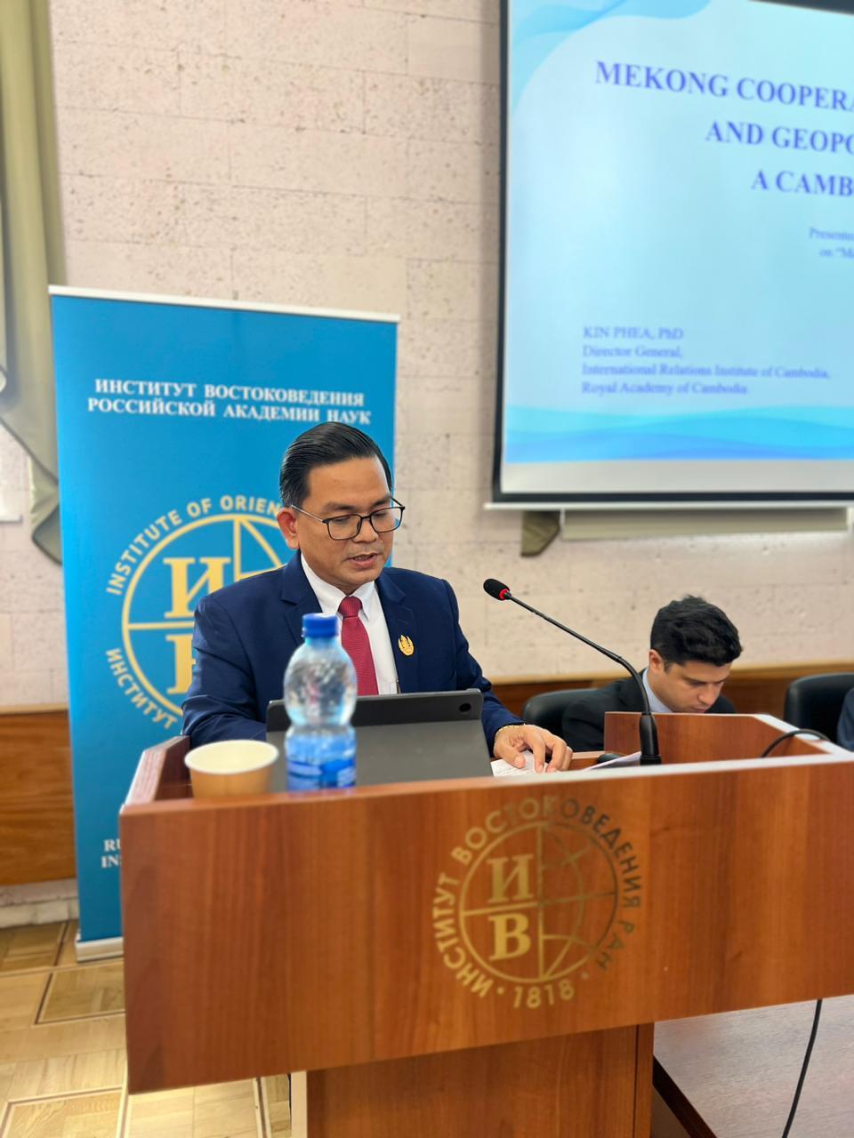 Рис. 2. Кин Пхеа выступает на конференции в стенах ИВ РАН. Фото ИВ РАН