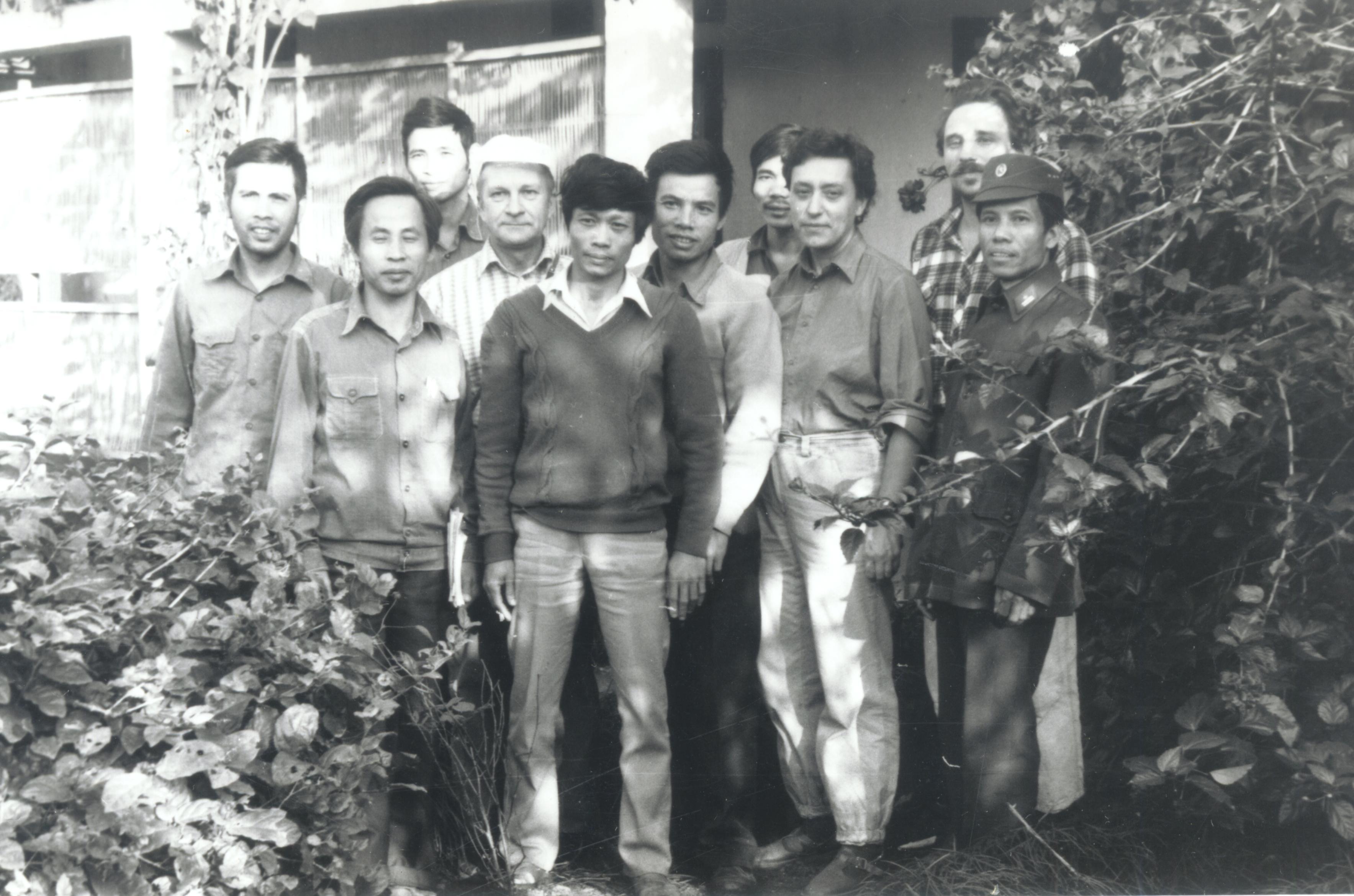 Рис. 3. Члены экспедиционного отряда по тропикостойкости вместе с вьетнамскими коллегами во время первого выезда в г. Хоабинь (декабрь 1988 года). Фото автора