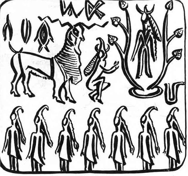Помимо отдельных изображений деревьев, животных и мифических персонажей, на протоиндийских печатях и оттисках имеется ряд сцен с несколькими участниками. Все эти сцены связаны с обрядами и мифами [Кнорозов 2022: 288–289].