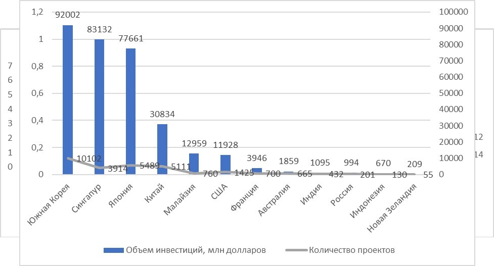 Как отмечалось выше, ключевым фактором привлечения рабочей силы и студентов из Вьетнама является объём инвестиций каждой страны-партнера (рис. 1). И если первые позиции по объёму инвестиций удерживает Южная Корея, то 2-е место занимает Сингапур с отставанием всего лишь в 10%, тогда как еще в 2023 г. на 2-м месте располагалась Япония. При этом следует учитывать, что количество самих проектов Южной Кореи во Вьетнаме практически в 3 раза превышает показатели Сингапура и в 2 раза – Японии.