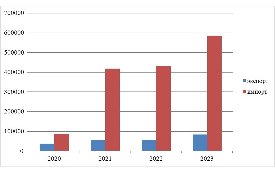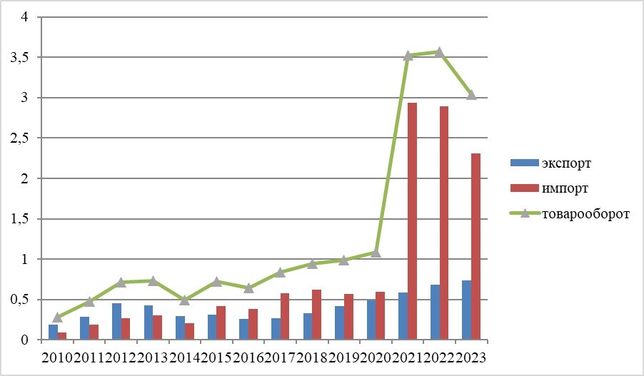 В 2010–2023 гг. торговля сельскохозяйственной продукцией росла быстрыми темпами – на 21% в год. В итоге объёмы двусторонних поставок возросли более чем в 10 раз – с 280 млн до 3 043 млрд долл. США (рис. 2).