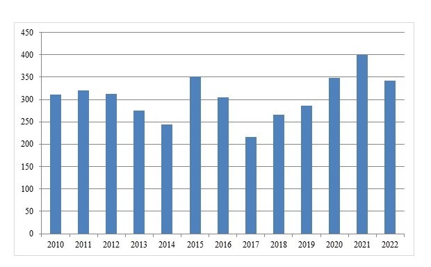 Вьетнам уже долгие годы удерживает позиции ведущего экспортера кешью в мире, неуклонно наращивая поставки данного вида продукции на мировые рынки. Однако при детальном рассмотрении торговых потоков кешью вырисовывается явная тенденция укрепления позиций реэкспорта, нежели собственного производства. Так, в 2010–2022 гг. производство кешью было подвержено существенным колебаниям, и его средние темпы роста не превышали 0,7% (рис. 3). В то же время экспорт кешью из Вьетнама увеличивался на 13% ежегодно. Ещё динамичнее страна наращивала импорт кешью – на 22% [FAOSTAT: 21.02.2025], что безусловно сыграло ключевую роль в захвате и удержании позиций мирового экспортера.