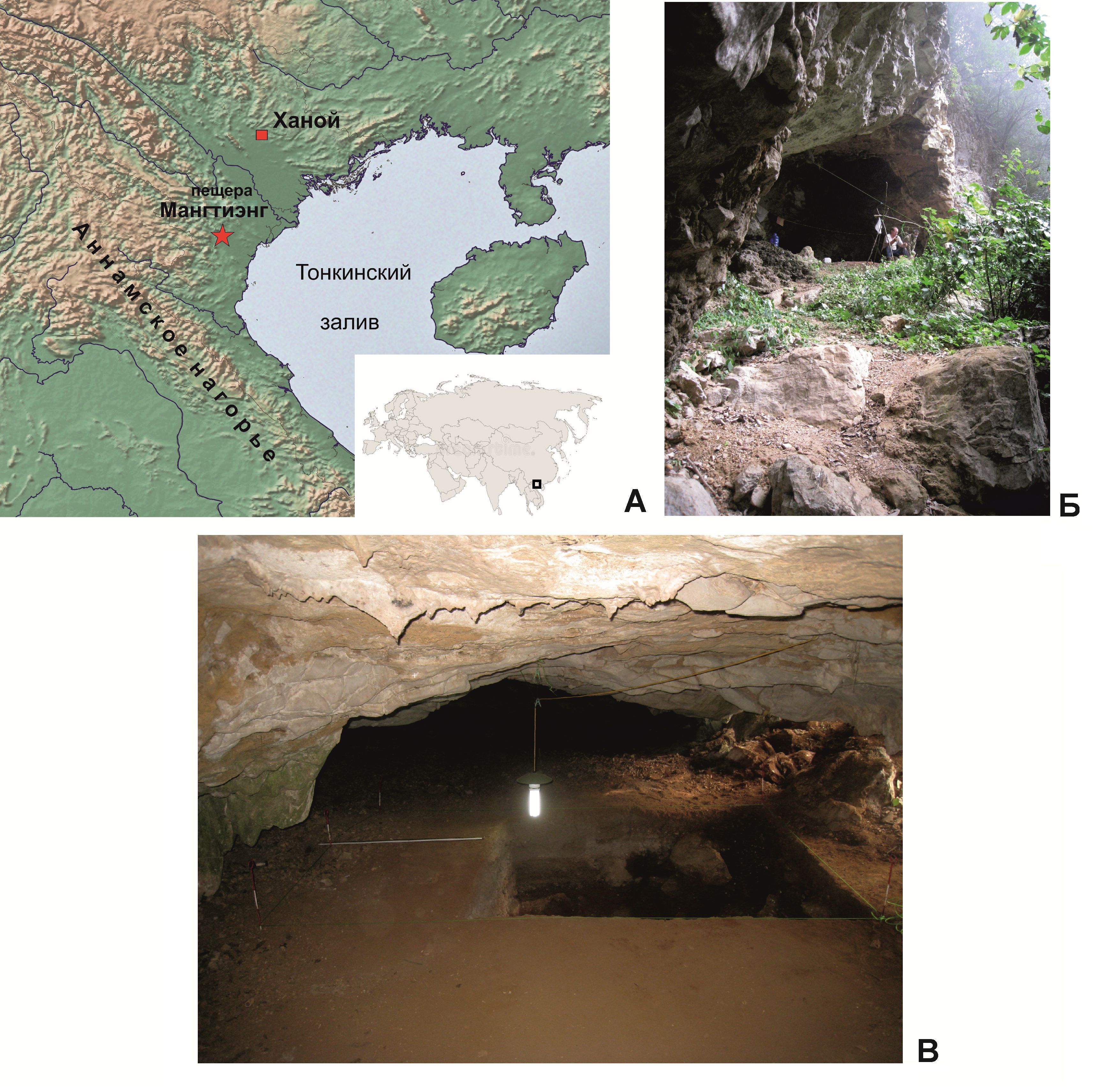 Рис. 1. Расположение пещеры Мангтиенг (А), общий вид на вход в пещеру (Б), вид на раскоп 2012 г. в пещере с юго-запада (В).