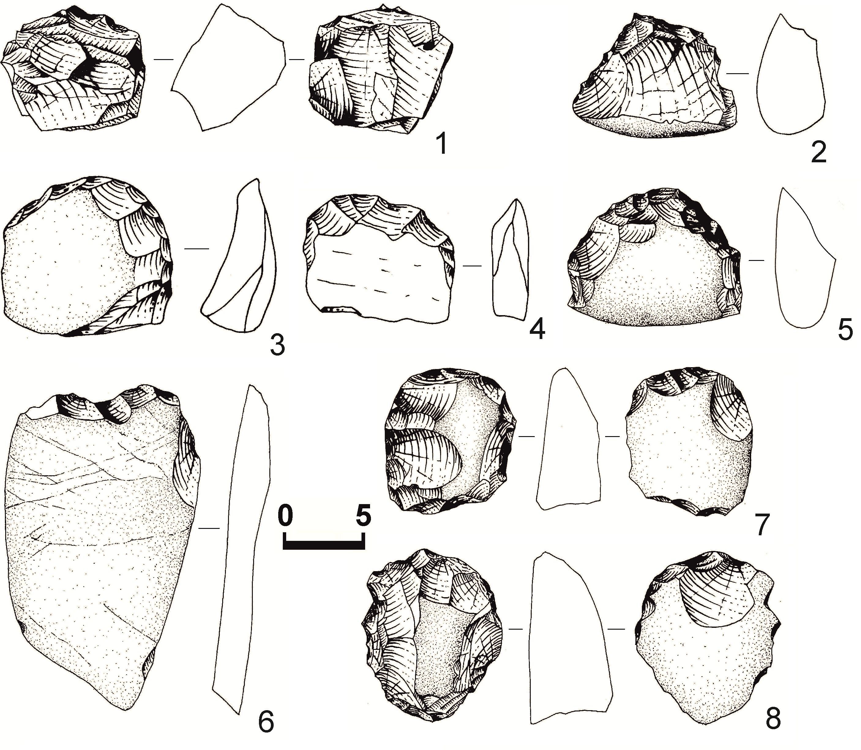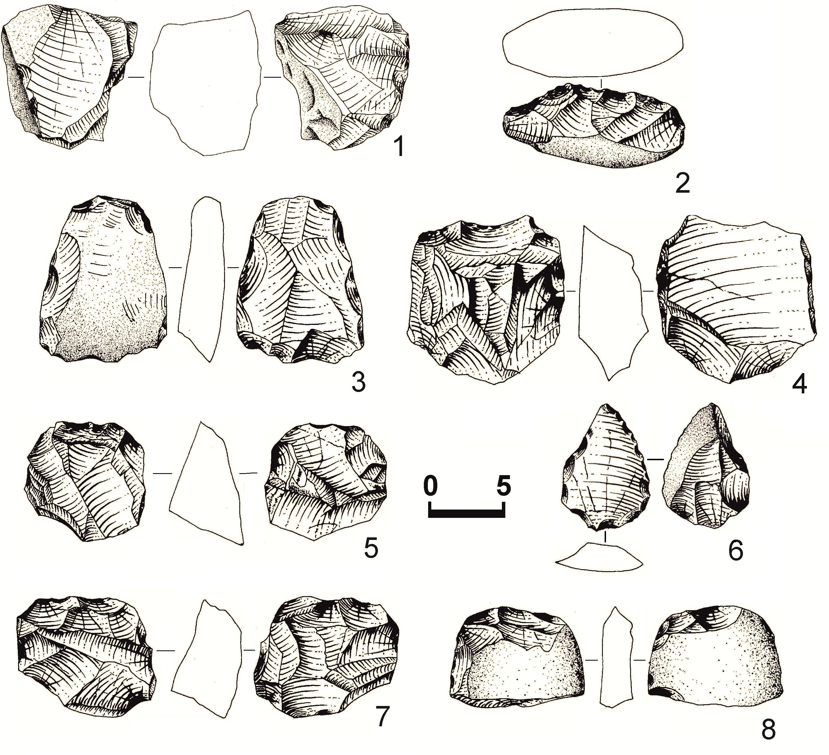 Рис. 4. Одноплощадочный монофронтальный нуклеус (1), конвергентное скребло (2), короткие топоры (3-5), тесло (6) суматралиты (7,8) из слоя 2 пещеры Мангтиенг