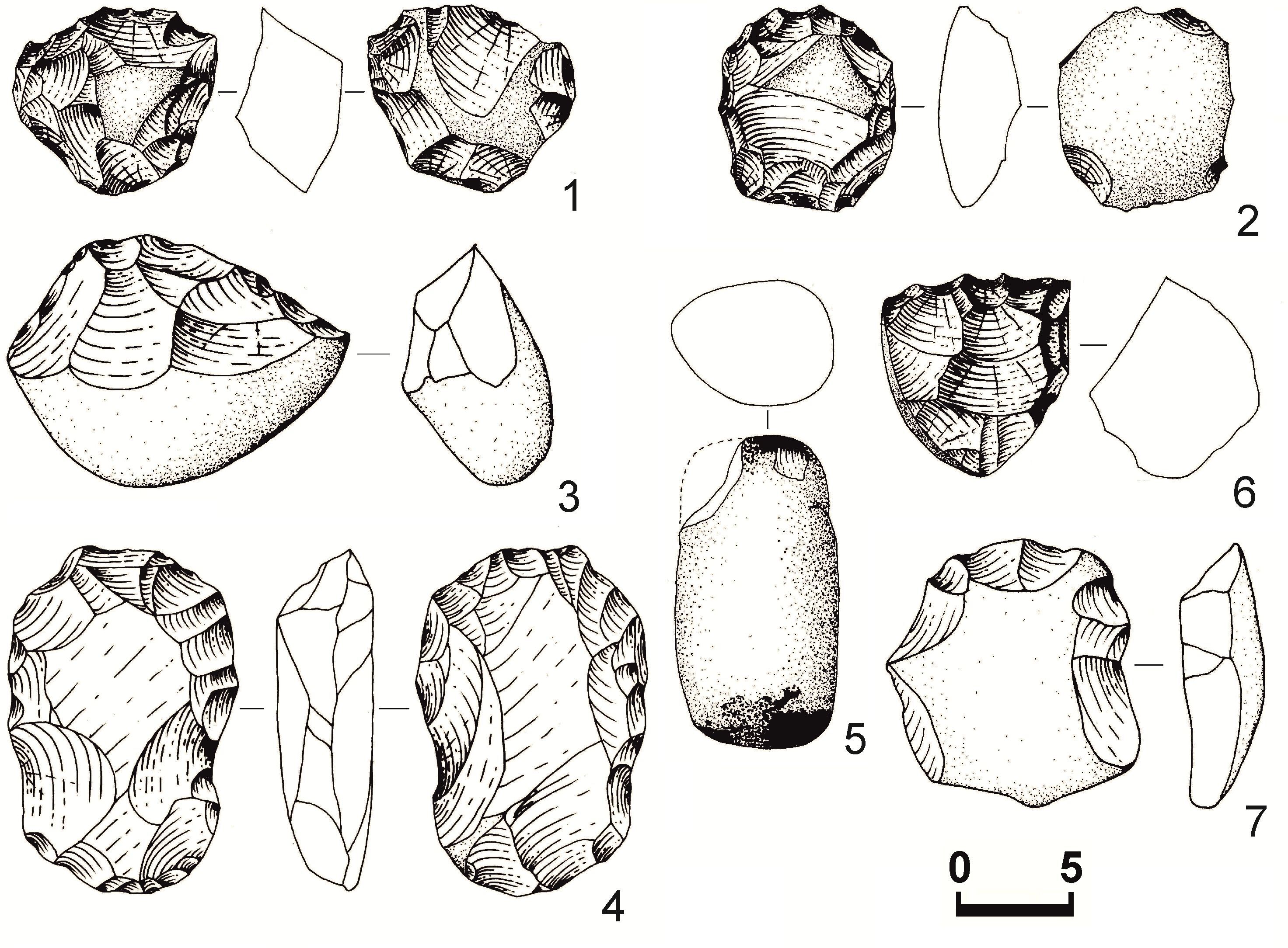 Орудийный набор насчитывает 14 предметов. Для конвергентного скребла исходным сырьем служила намеренно фрагментированная плоская галька (рис. 4,2). Края оформлены непрерывной, в одном случае зубчатой, в другом чешуйчатой, ступенчатой разнофасеточной ретушью.