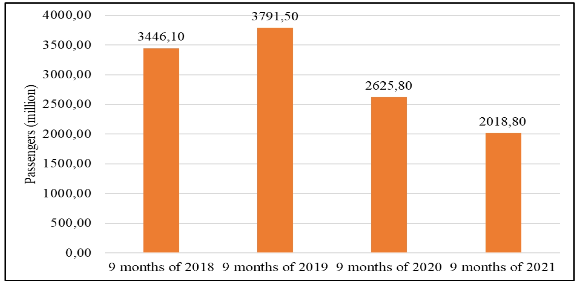 In September 2021, the passenger transport industry continued to face difficulties. Due to the fourth outbreak of the COVID-19 pandemic, many localities implemented social distancing. Travel restrictions significantly reduced the number of passengers. In nine months of 2021, the data showed a moderate decrease of 607 million passengers compared to that in the same period of 2020. Notably, the figure for 2021 was 46.8% and 41.4% less than that of 2019 and 2018 in turn (Graph 2).