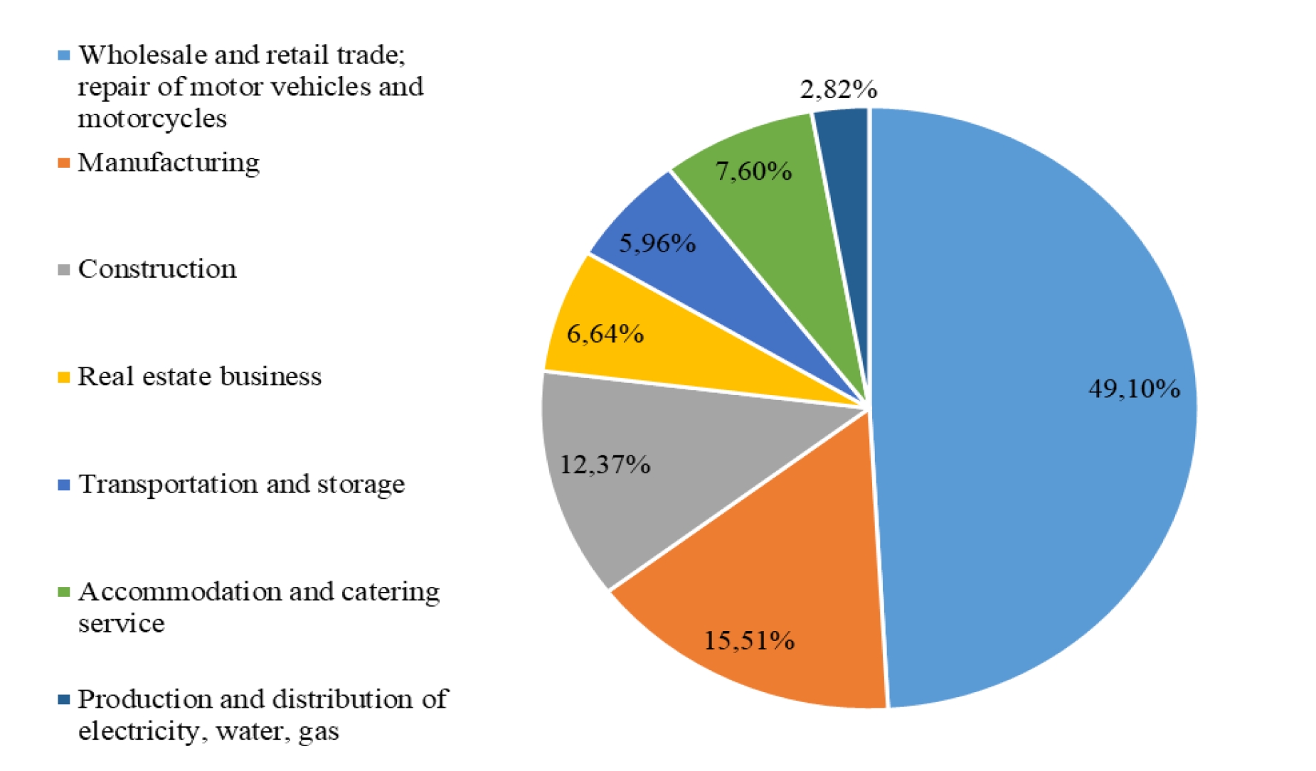 Although many measures have been implemented to hold out during the epidemic, as of the end of September 2021, there were 90.3 thousand enterprises which suspended their business for a certain time, stopped operations waiting for dissolution procedures, and completed dissolution procedures, an increase of 78.5% compared to the data of the same period of 2019 – the pre-COVID era. The number was also higher than the same period of 2020, in the early days of the pandemic. Out of these 90.3 thousand enterprises, enterprises completing dissolution procedures focused on certain fields mainly were on the wholesale, retail, repair of cars and motorcycles, manufacturing enterprises, and construction enterprises (Graph 5).