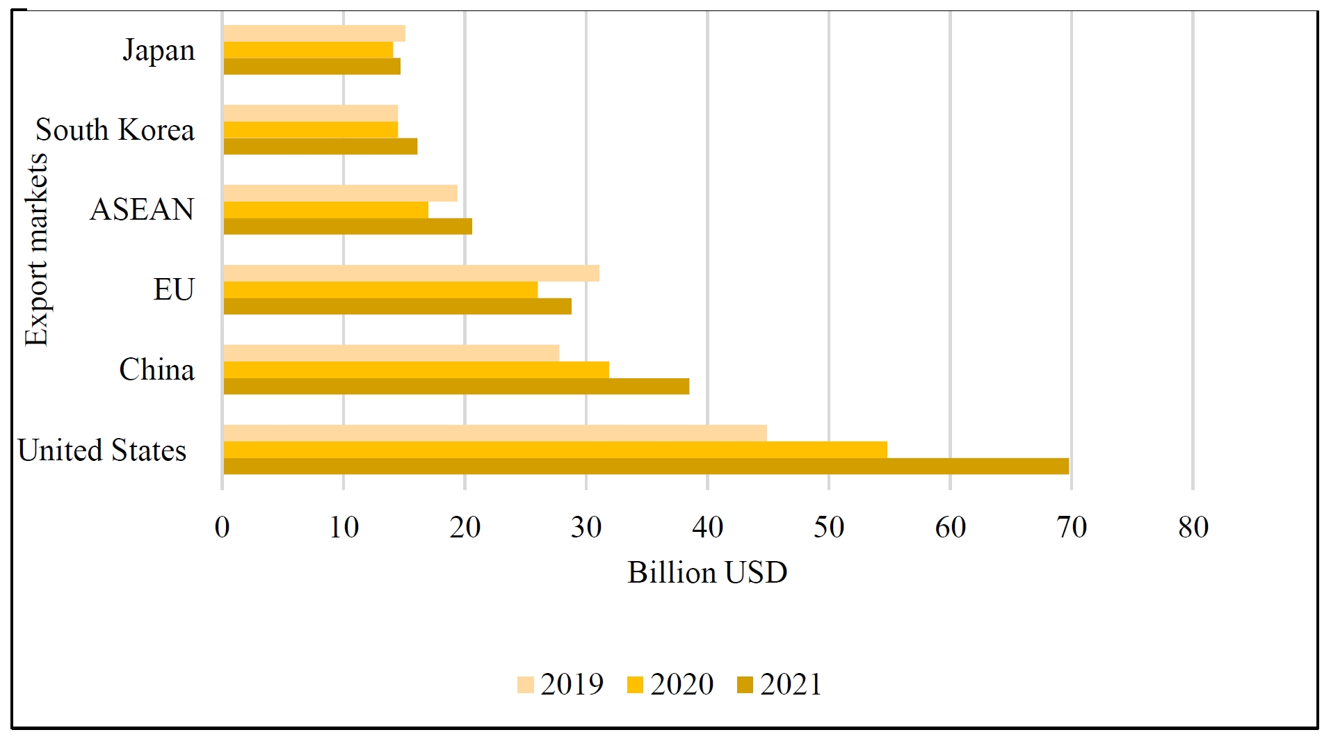 Regarding the commodity export market in the first nine months of 2021, the United States was Vietnam’s largest export market with a turnover of 69.8 billion USD, a growth of 27.6% over the same period of 2020. The following was China market with 38.5 billion USD, going up by 18.3%. The EU with 28.8 billion USD, rose by 16.6%. ASEAN market with 20.6 billion USD, an increase of 21.2%. South Korea with 16.1 billion USD, an increase of 11.4%. Japan with 14.7 billion USD, increased by 5.1%. (Graph 7). Compared to the data of 2019, only the largest market and the fourth one, which were the US and ASEAN, remained its order. Whilst, Vietnam’s export value to Korea exceeded the figure for Japan and the data for China was also over that of the EU.