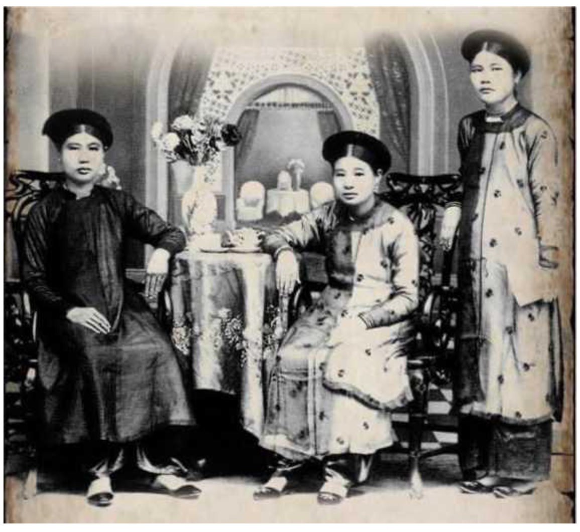 Fig. 3. Women from a wealthy family in áo năm thân costumes. North Vietnam, 1910–1920.