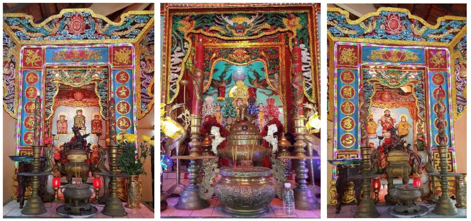 Правый алтарь (рис. 2, фото справа) посвящен богине Тхиен-и А-на (Thiên Y A Na), изображённой в сопровождении своих сыновей. Тхиен-и А-на ведет свое происхождение от По Нагар — наиболее влиятельной богини чамов, покровительствующей земледелию. У вьетнамцев она выступает в роли богини бурь, наводнений и подательницы дождя [Кнорозова 2020: 371–375]. Предание повествует о девушке-подростке, удочерённой пожилыми родителями, которая, повзрослев, исчезла в море во время бури, спаслась «на севере», вышла замуж за принца и родила ему двоих сыновей, но затем, оставив мужа, вернулась с детьми в родные места и, поставив храм уже умершим родителям, вознеслась феей на небо [Кнорозова 2000: 72–73, 173]. Почитание Тхиен-и А-на чрезвычайно распространено в центральном и южном Вьетнаме. В общинном доме Тхангтам, помимо алтаря в храме женских духов, ей установлен ещё один алтарь в дополнительном павильоне, пристроенном к общинному дому.