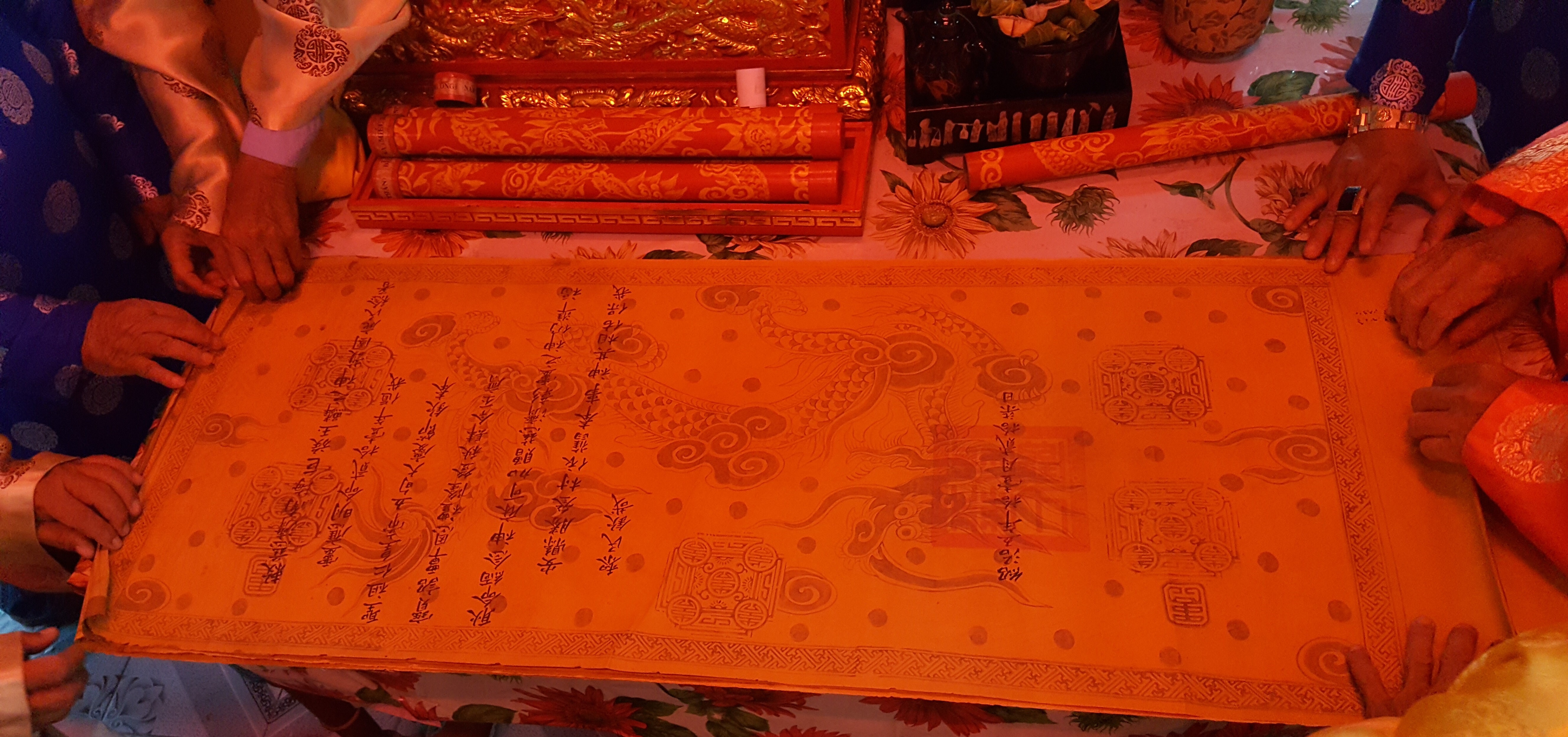 В Вунгтау общинный дом был построен в начале XIX в., когда придворные тексты о духах уже не составлялись, но императорский двор все еще утверждал их пантеон, издавая соответствующие указы. Главным духом-покровителем поселения Тхангтам стал его основатель – полководец, а «вспомогательные» духи (в том числе богиня Тхиен-и А-на) получили алтари в пристроенном павильоне. Позднее на территории общинного дома появились дополнительные храмы, что, по-видимому, стало шагом властей навстречу вернакулярным культам, издавна распространённым в этой местности, – культу женских духов и культу духа кита. Эти духи, оказавшись на территории общинного дома, получили признание двора, издавшего указы, которые объявляли их также покровителями местности [Phạm Chí Thân 2008]. Некоторые из этих указов автору удалось увидеть во время праздника в честь главного духа-покровителя в апреле 2018 г. (рис. 3).