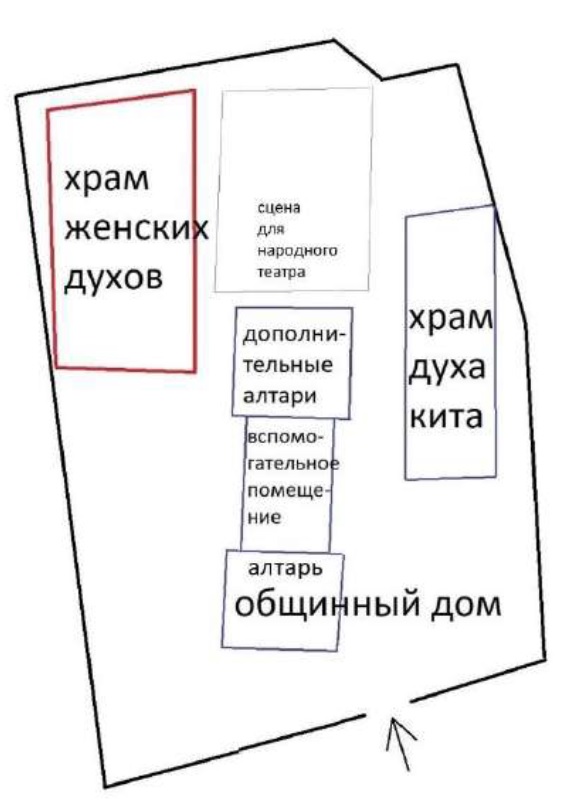 Классический вариант общинного дома (рис. 5а) предполагает перемещение по территории от профанного пространства к сакральному: на входе мы видим вспомогательные помещения, а в глубине двора – собственно общинный дом с алтарями. В общинном доме Тхангтам в г. Вунгтау этот принцип нарушен (рис. 5b). Оказываясь на территории, мы сразу видим главный павильон общинного дома с алтарём верховного духа-покровителя, а уже за ним находятся хозяйственные пристройки и дополнительные храмы. Если расположенный справа храм духа кита является местом поклонения рыбаков, то храм богинь пяти стихий, построенный слева за главным павильоном, можно охарактеризовать как место поклонения жен рыбаков. Как видим, дополнительные храмы носят гендерный характер. При этом от входа на территорию открывается вид на главный павильон и на храм кита, тогда как женский храм «спрятан» за павильонами и пристройками. Вероятно, участие женщин в церемониях в общинном доме (в целом недопустимое) в данном храме предполагалось изначально, но не демонстрировалось широкой аудитории.