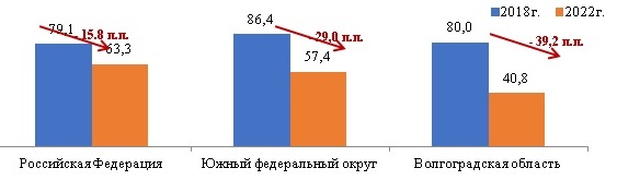 Результаты аналогичного исследования, проведенного в Волгоградской области, показали также положительную динамику с увеличением показателя посещаемости на 44,8 %. Абсолютные величины в 2018 г. составляли 275 366 посещений, а в 2022 г. их было 398 688. Обращает на себя внимание снижение посещений ПМК жителями сельских районов, практически на всех территориях. В целом по стране исследуемый показатель снизился на 15,8 п. п., в ЮФО – на 29,0 п. п., а в ВО – на 39,2 п. п., что на фоне роста общего числа посещений в передвижные подразделения может свидетельствовать о более широком внедрении передвижных форм работы среди городского населения (рис. 2).